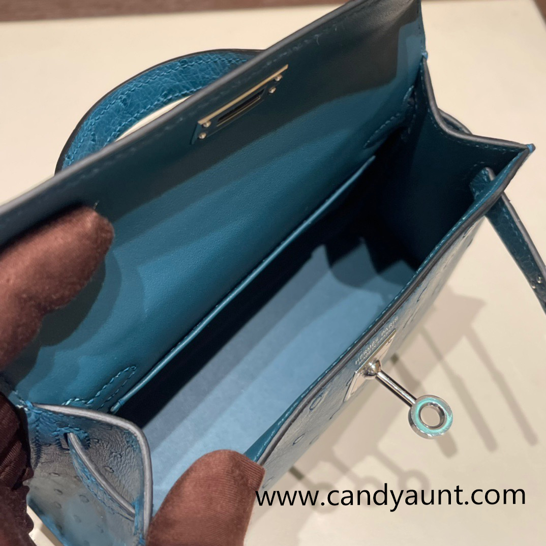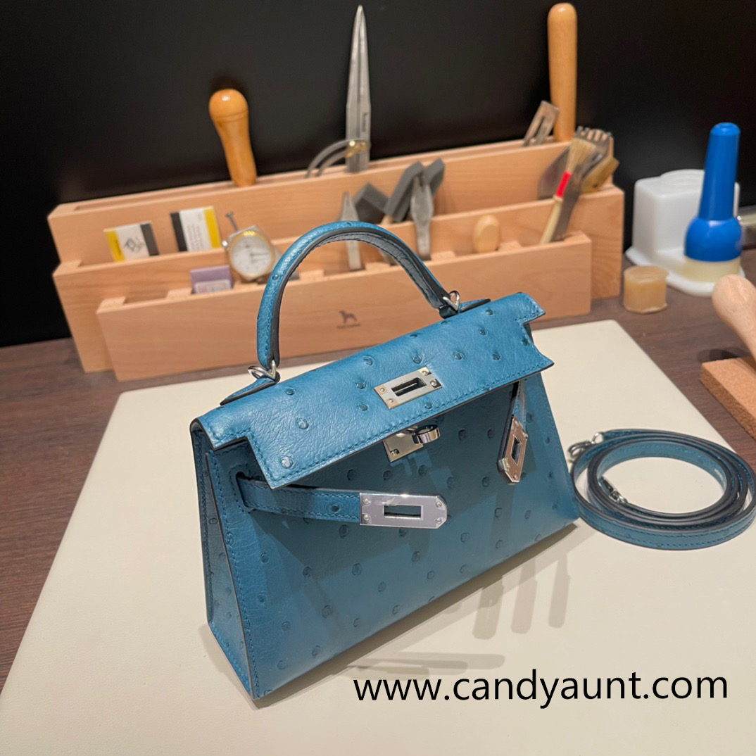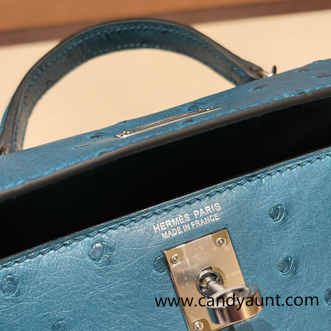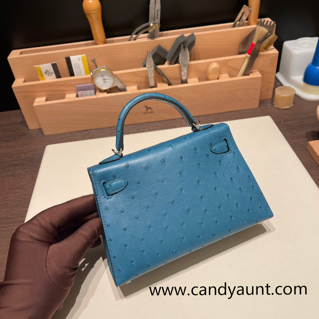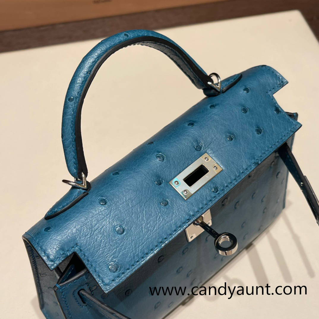 Hermes kelly20 ostrich 19cm J7 /Blue Lin Gold Hardware Full Handmade kellymini-019