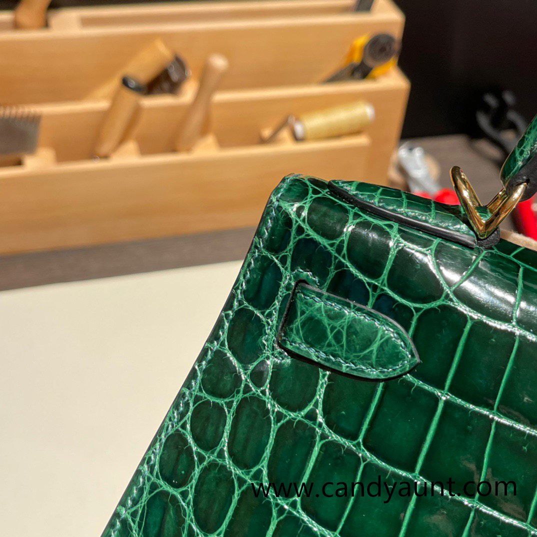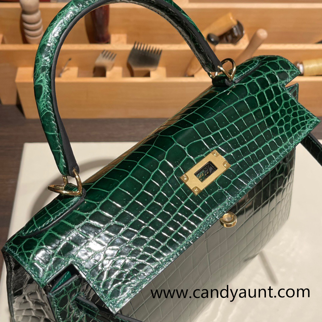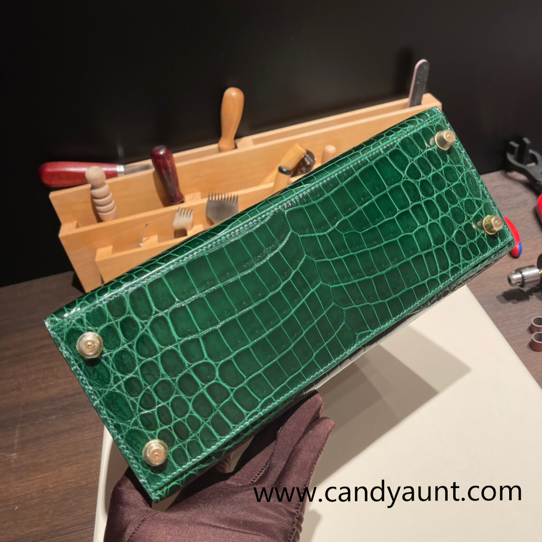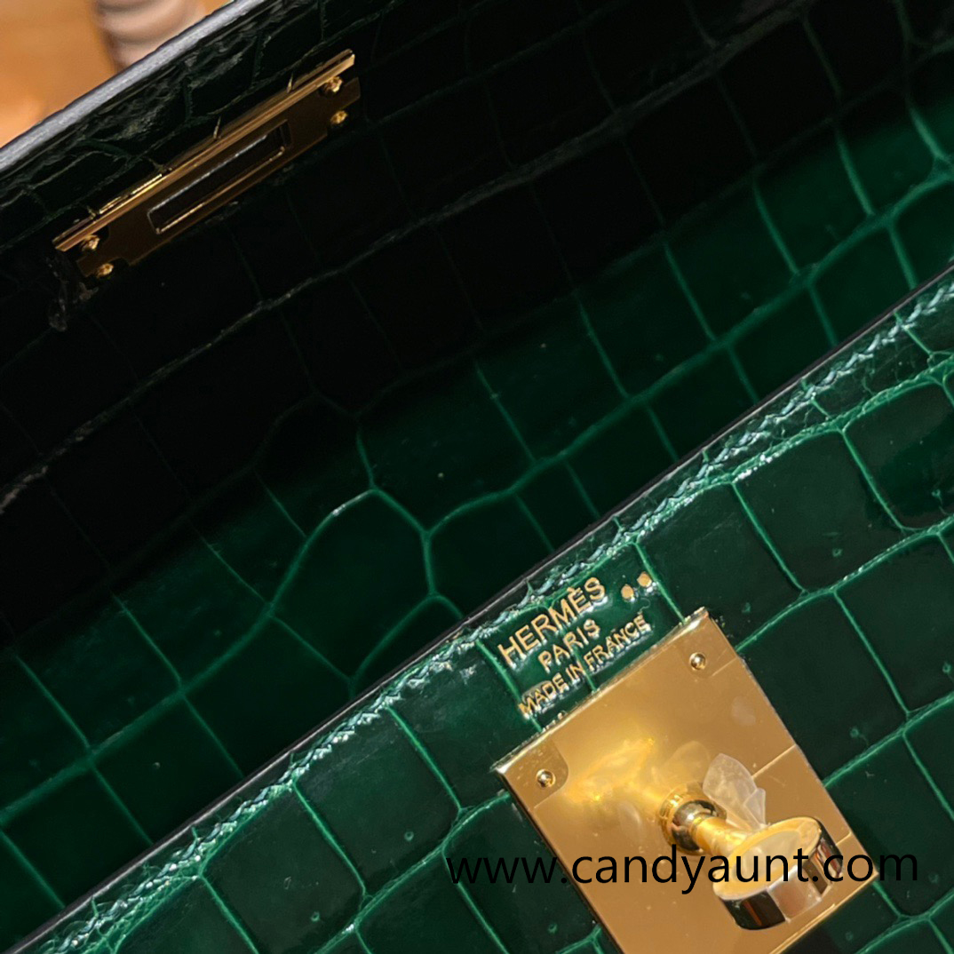 Hermes Kelly 28CM Shiny Crocodile 67 /Vert Fonce GoldHardware FullHandmade 009