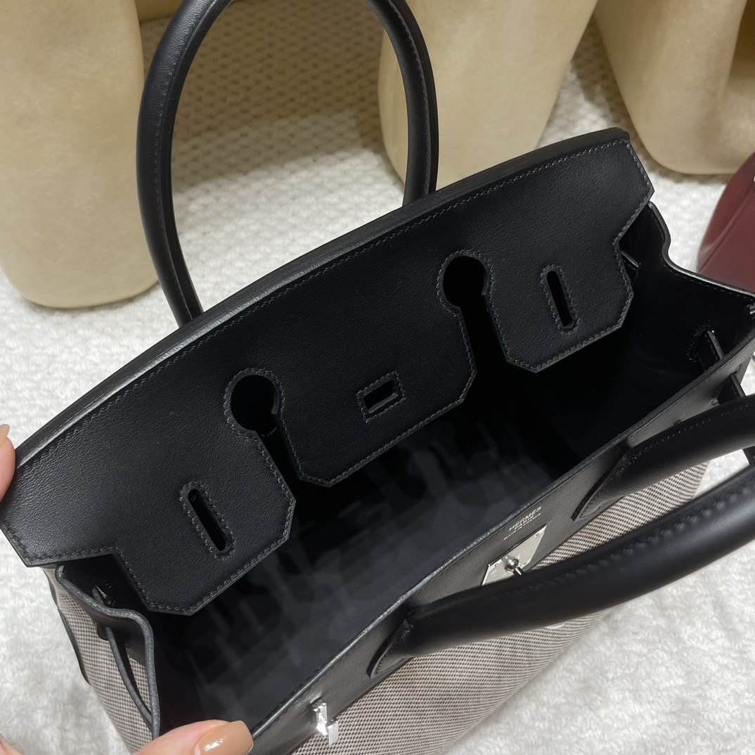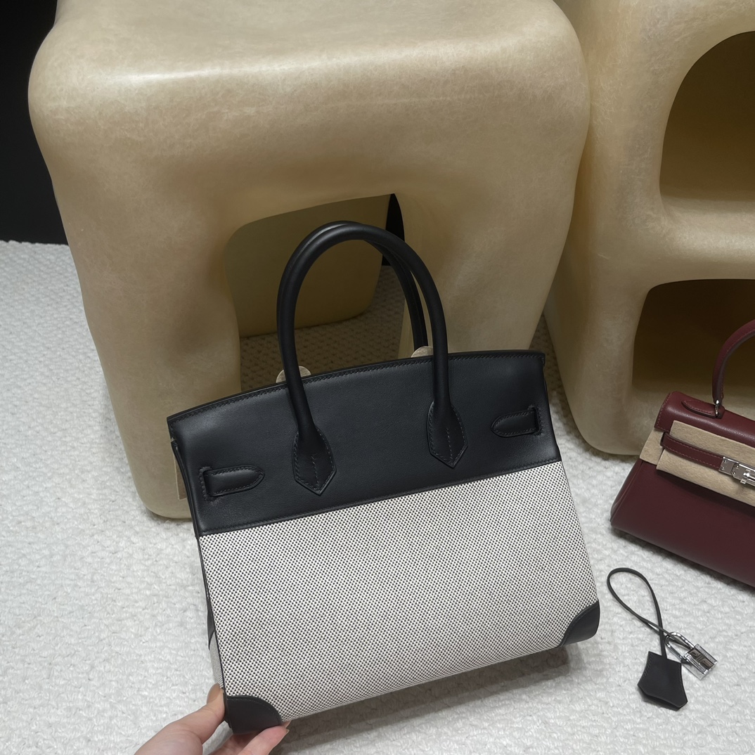 30cm Birkin (Fabric & Swift Leather) – Color: 89 Noir (with Silver Hardware) The fabric material creates a youthful vibe and is lighter than full-leather versions, which is its key feature.