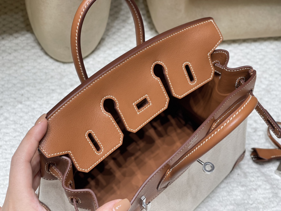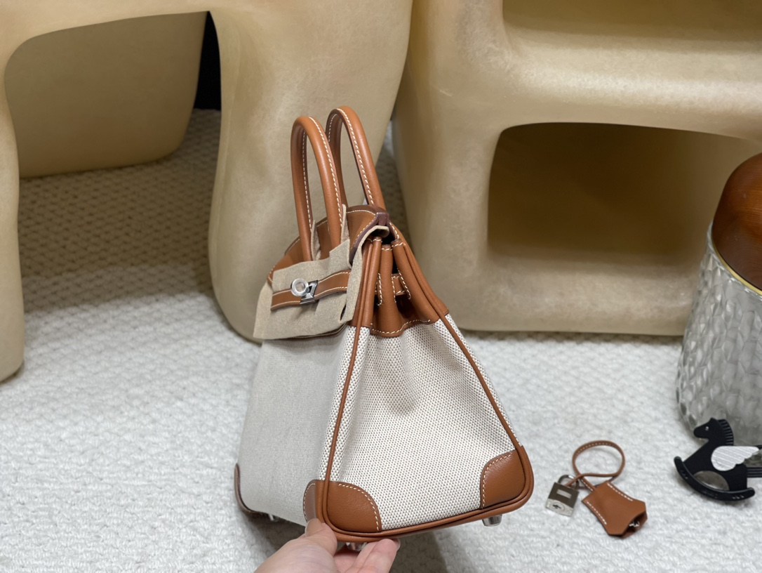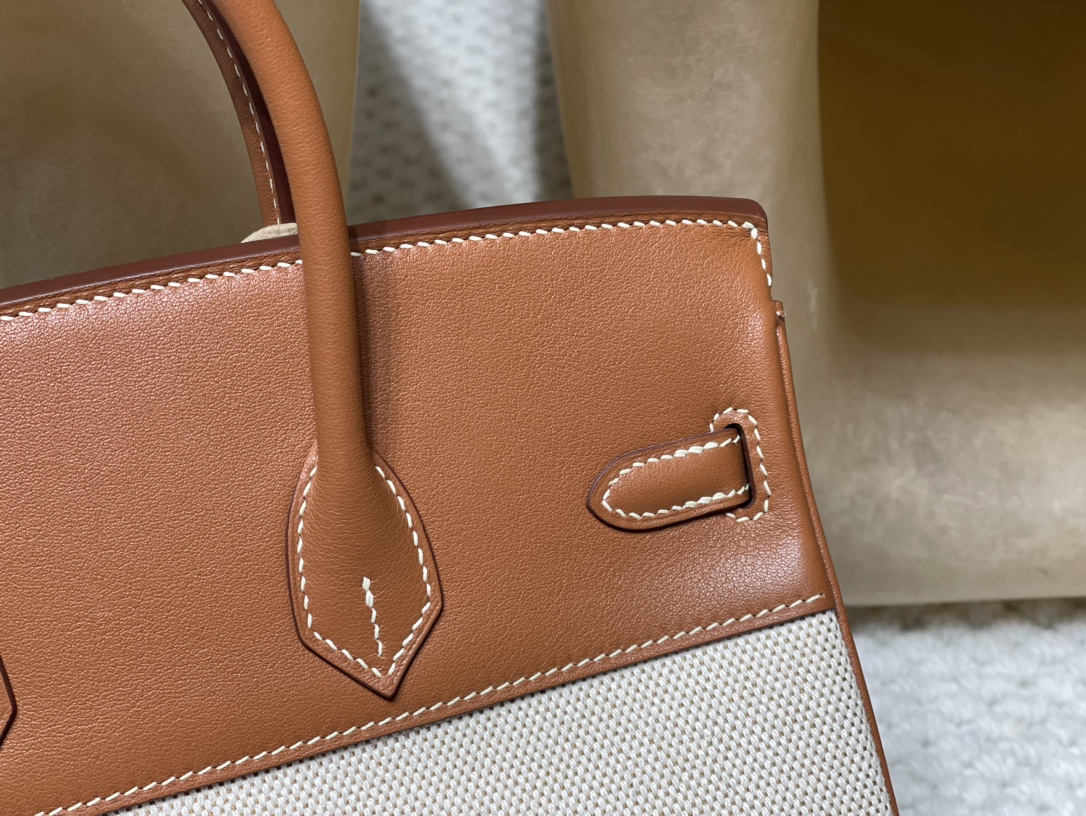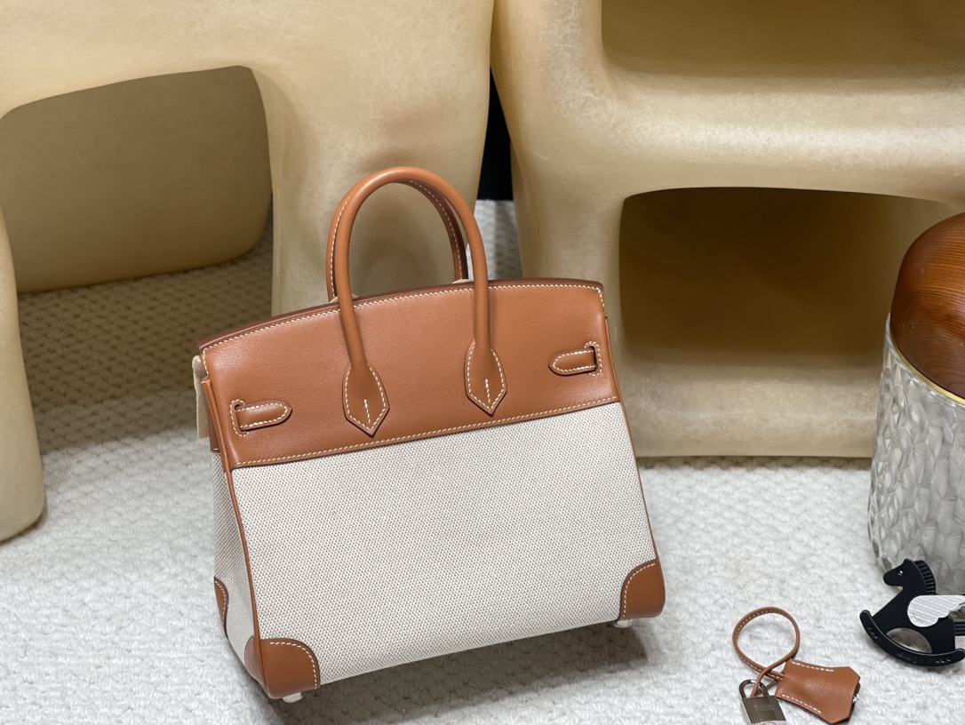 25cm Birkin (Fabric & Swift Leather) – Color: 37 Gold The fabric material gives a more youthful look and is lighter than full-leather versions, which is its key feature.