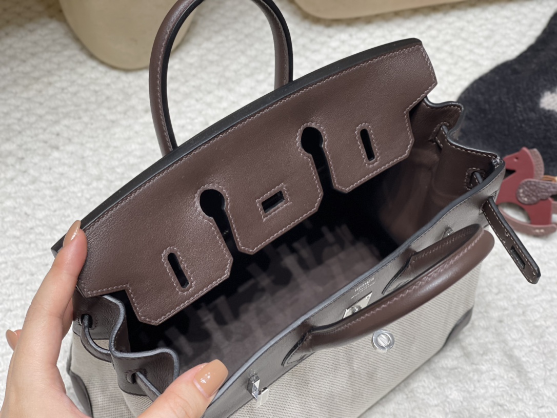 25cm Birkin (Fabric & Swift Leather) – Color: 46 Ebene The canvas material creates a more youthful atmosphere and is lighter and easier to use compared to full-leather versions, which is its key feature.