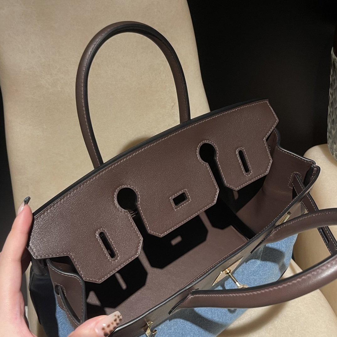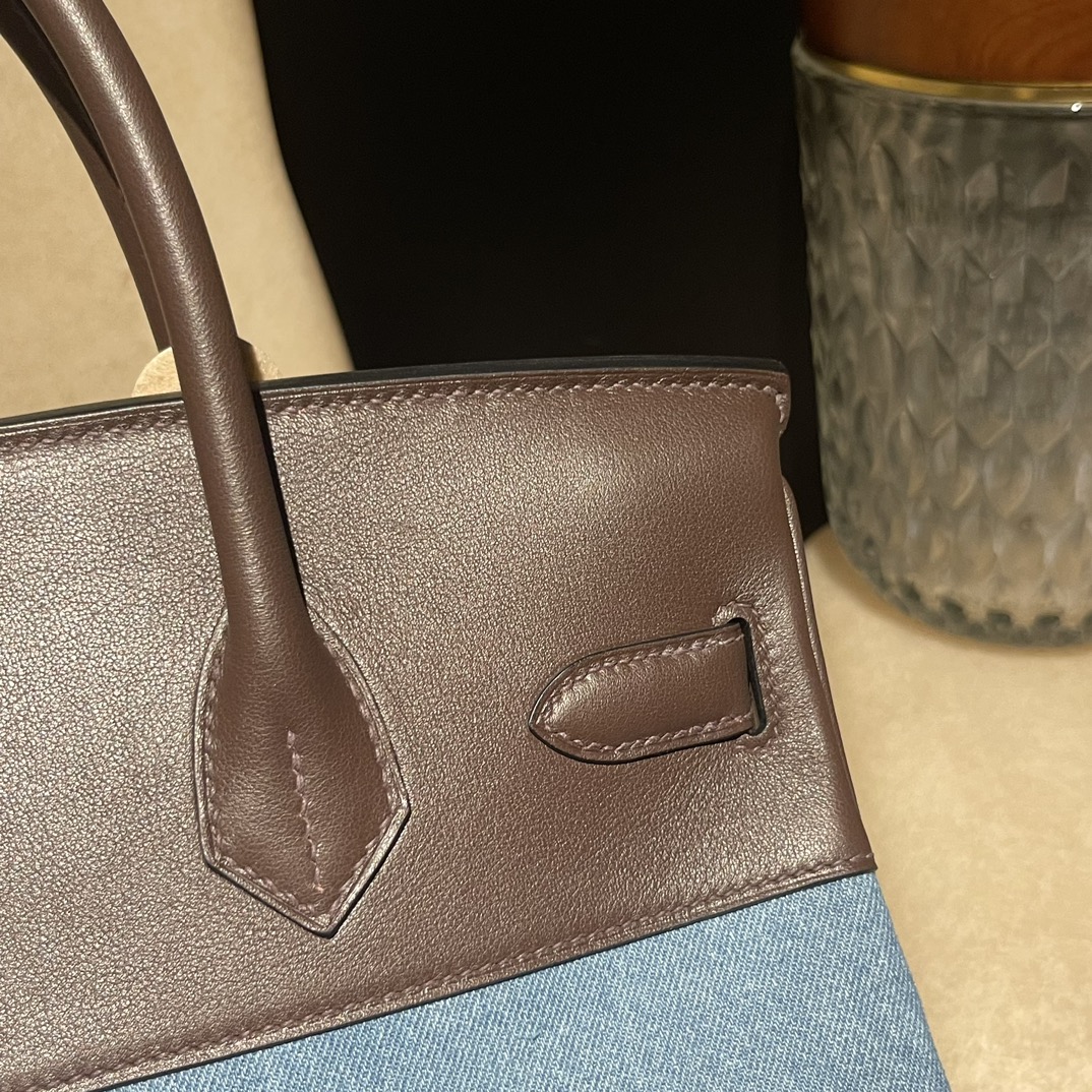 30cm Birkin (Swift Leather & Denim Canvas) – Color: 46/Ebene with Gold Hardware The perfect combination of Swift leather and canvas creates a profound vintage mood – a rare item with excellent investment potential.